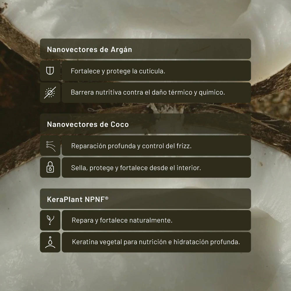 Keratina vegetal de amplio espectro de aminoácidos que ayuda a reparar daños térmicos y mecánicos, alisa la fibra, facilita el desenredado y devuelve nutrición e hidratación profunda.