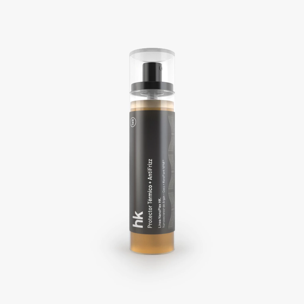Al agitarlo, ambas fases se fusionan creando una bruma ultraligera que envuelve la fibra capilar, sellando la cutícula y formando una barrera protectora frente al calor, la humedad y la estática.
